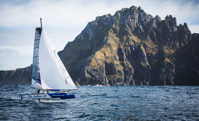 No fue un desafío sencillo. Hubo que esperar durante tres días a que el viento dejara de registrar rachas de hasta 50 nudos. Finalmente, a las 7:00 horas el día D, los protagonistas logran zarpar. Dos horas después, comienza el asalto final: Yohannes y Franck se enfrentan a este acantilado de casi 400 metros cubiertos de vegetación. El catamarán va adquiriendo poco a poco velocidad hasta que sus cascos comienzan a elevarse por encima del agua. Están foileando, volando. Son los pioneros, misión cumplida. El equipo de apoyo lo celebra por todo lo alto con la tradicional botella de whisky incluida.