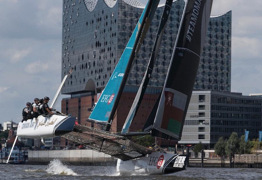 El río Elba, cerca de la zona de Hafen City en Hamburgo, se transformó en el estadio perfecto para disputar la última prueba. El estrecho río, el tráfico, fuertes corrientes y un viento flojo y cambiante, le pusieron las cosas difíciles a la flota de la Extreme Sailing Series durante la primera jornada, en la que el Oman Air ganó las dos primeras mangas.